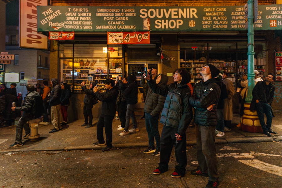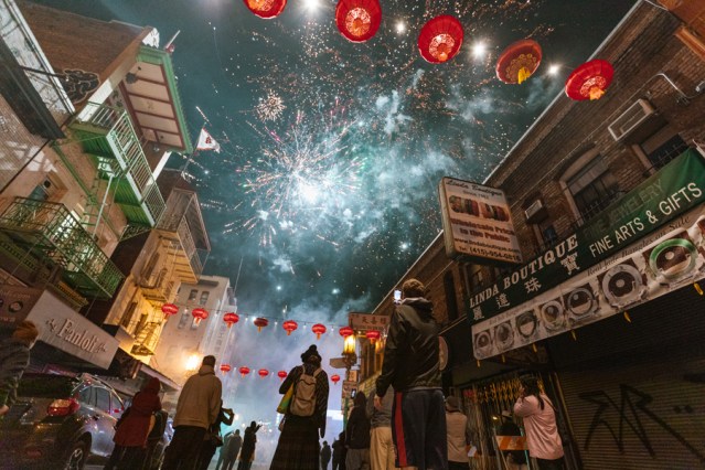 Spectators gather in front of Red’s Place to watch a massive fireworks display in San Francisco’s Chinatown.