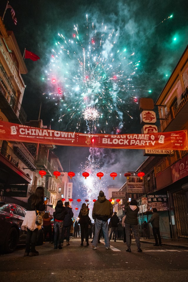 A crowd of spectators looks up as a fireworks explosion illuminates Grant Avenue.
