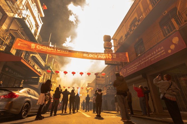 Spectators watch a massive fireworks display in San Francisco’s Chinatown on Monday night, Feb. 16. Fireworks and firecrackers are a traditional part of Lunar New Year, believed to ward off evil spirits and bring good fortune.