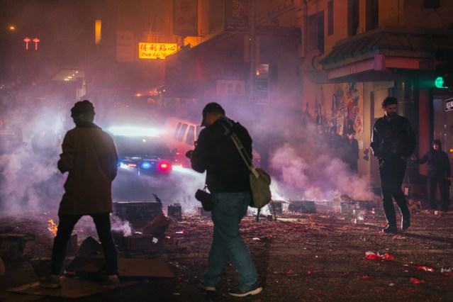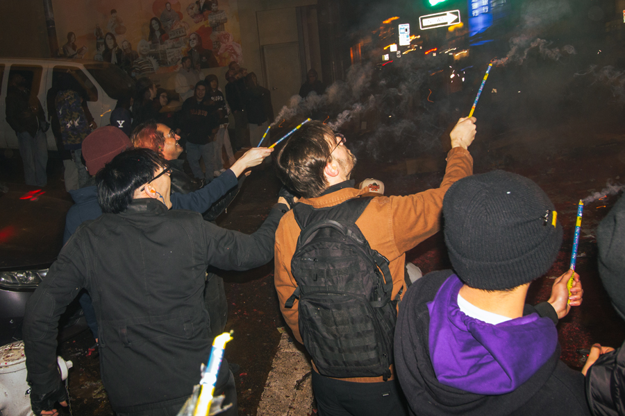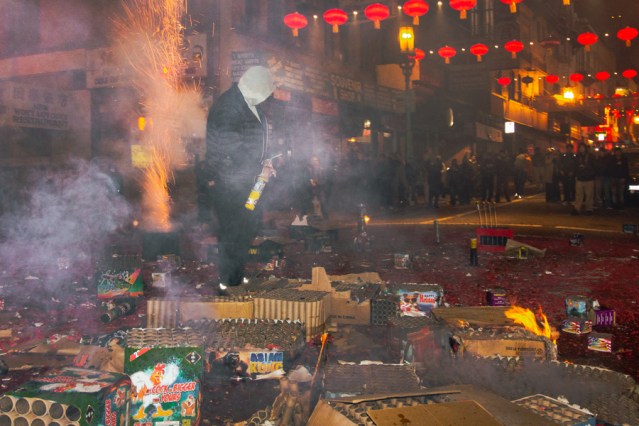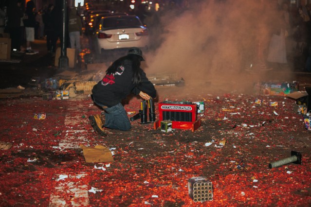 Fireworks ignited at street level filled Chinatown with smoke, noise and flashes of light.