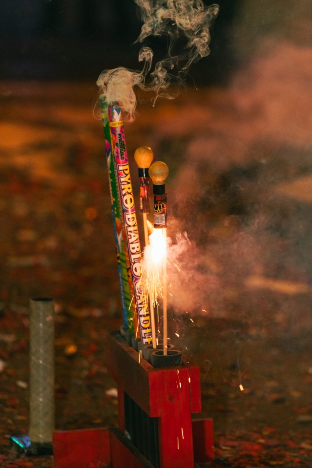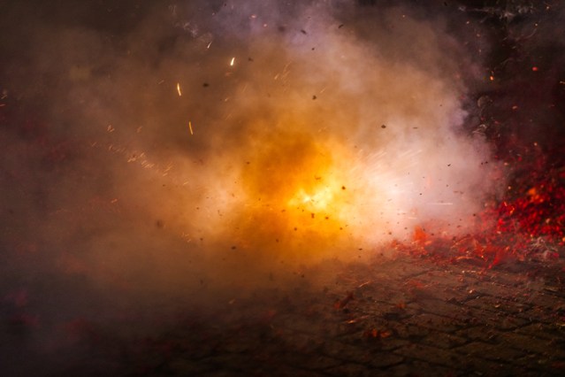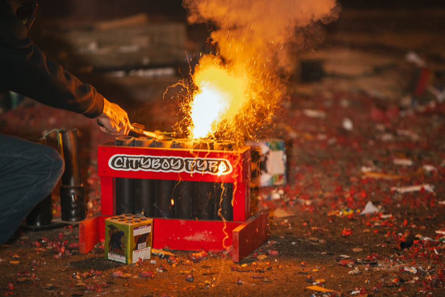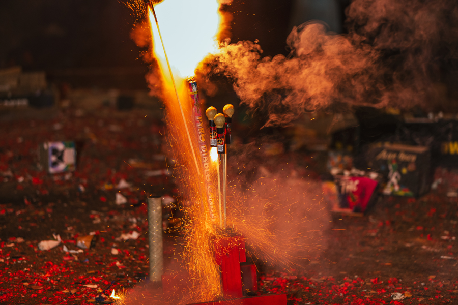 Fireworks erupt in the middle of a street during Lunar New Year celebrations.