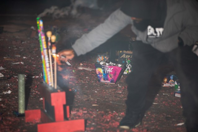 A firework erupts from the street as people stand nearby beside parked cars. Fireworks are a traditional part of Lunar New Year festivities, though their use in crowded streets has long raised safety and enforcement concerns.