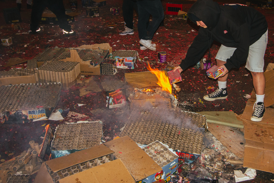A man lights fireworks at an intersection in San Francisco Chinatown, Calif. on Lunar New Year’s Eve, Feb. 16, 2026. Spent red firework casings cover the street, reflecting the volume of fireworks ignited as crowds gathered to mark the holiday.