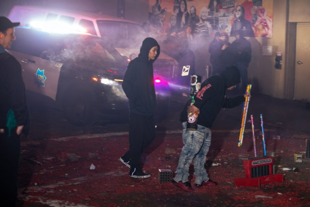 Two men remove fireworks from the street as a San Francisco police vehicle illuminates lingering smoke. Fireworks activity halted shortly after police arrived, with smoke still hanging in the air from fireworks that had just been set off.