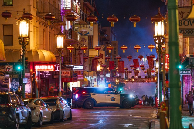 A San Francisco Police Department vehicle blocks Grant Avenue near Jackson Street during Lunar New Year celebrations on Feb. 16, 2026, in San Francisco. The intersection of Grant Avenue and Jackson Street is the center of Lunar New Year fireworks activity in Chinatown, and police closed off the block as fireworks were set off nearby.