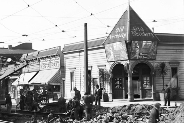 Above: This photo, taken on Feb. 10, 1908, shows Old Nurnberg at Eighth and Fulton, one of the many bars and taverns that lined Fulton in the Inner Richmond, a remnant of Beertown. Beertown was the name given to a five-block stretch of Fulton, which started in the 1870s with watering holes servicing patrons of the Bay District Race Track (1875-1896). The horse-racing track covered approximately 15 blocks from First Avenue (Arguello Boulevard after 1909) to Fifth Avenue, and “A” Street (Anza after 1909) to “D” Street (Fulton after 1895). Photo courtesy of a private collector/Western Neighborhoods Project/OpenSFHistory.